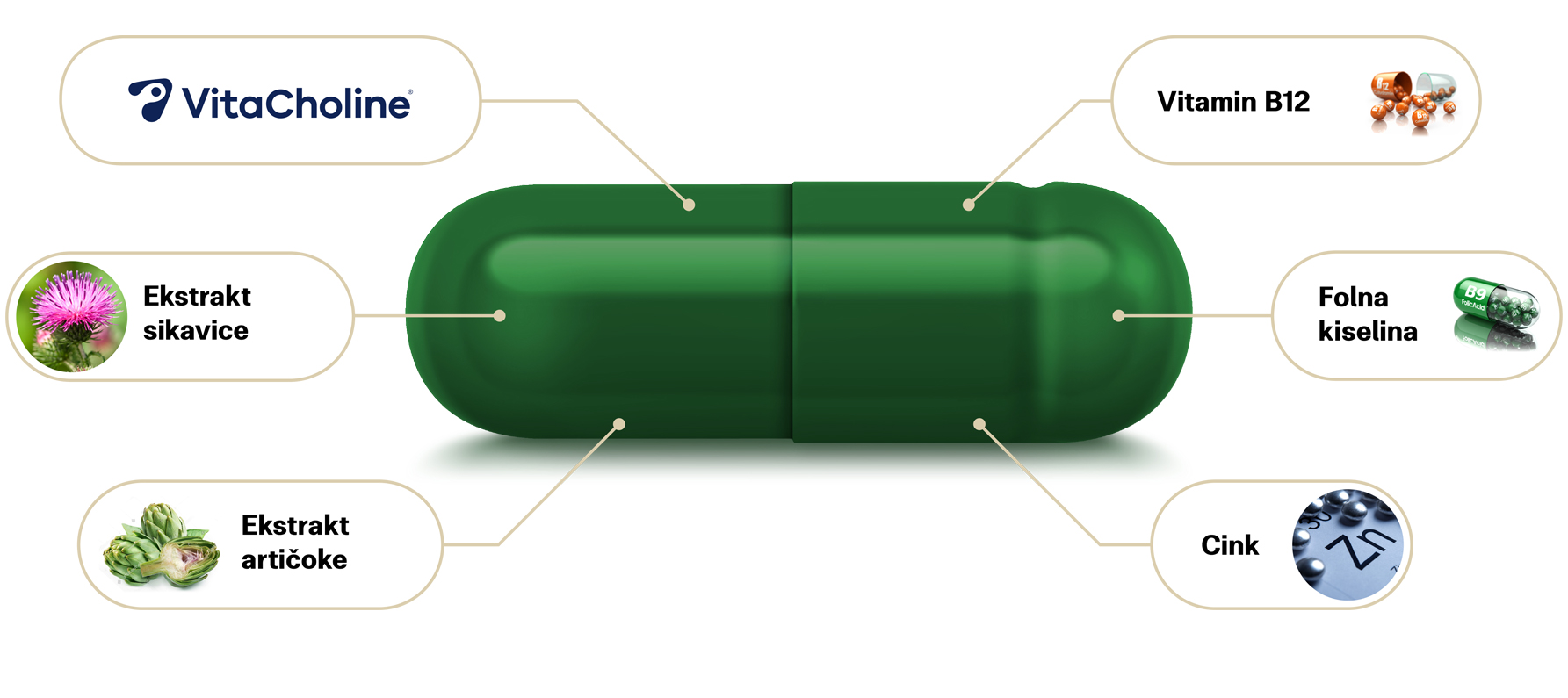 Sastojci: kolin bitartrat, standardizirani ekstrakt sjemenki sikavice (Silybum marianum L.) sadrži 80% silimarina DER 15:1, hidroksipropilmetilceluloza, ekstrakt lista artičoke (Cynara scolymus L.) DER 5:1, zgušnjivač: celuloza, cinkov oksid, tvar za sprečavanje zgrudnjavanja: kalcijevi fosfati, zgušnjivač: magnezijeve soli masnih kiselina, tvar za sprečavanje zgrudnjavanja: silicijev dioksid, cijanokobalamin, stabilizator: gellan guma, bojilo: bakreni kompleksi klorofila i klorofilina (E 141), pteroilmonoglutaminska kiselina.
